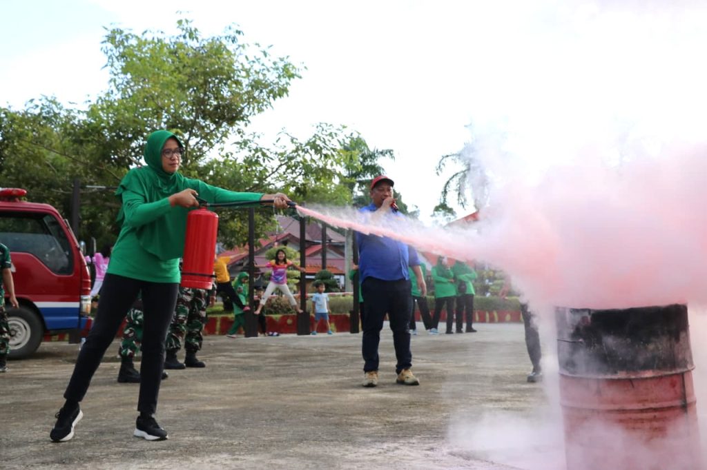 Tingkatkan kewaspadaan sejak dini. Deninteldam VI/Mlw menggandeng BPBD Kota Balikpapan memberikan edukasi dan simulasi penanggulangan kebakaran kepada prajurit dan keluarga besar satuan. Foto: Ist