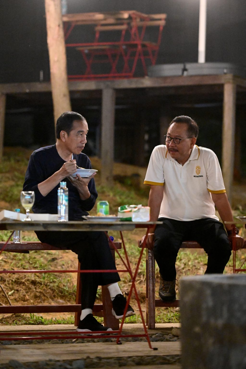 Pada malam hari, tampak Presiden Jokowi yang duduk di antara Kepala Otorita IKN Bambang Susantono dan Kurator Pembangunan IKN Ridwan Kamil, menikmati malam dengan menyantap nasi goreng jawa.
