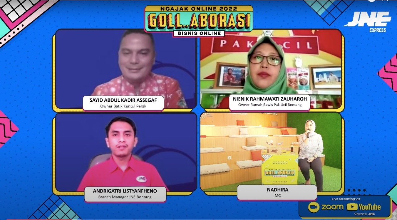 Dalam acara ini, hadir dua narasumber dari pegiat UMKM yaitu Nienik Rahmawati Zauharoh selaku Owner Rumah Bawis Pak Ucil Bontang dan Sayid Abdul Kadir Assegaf selaku Owner Batik Kuntul Perak. Melalui webinar roadshow ini JNE berkomitmen mendukung UMKM untuk mampu berinovasi dan meningkatkan daya saingnya.