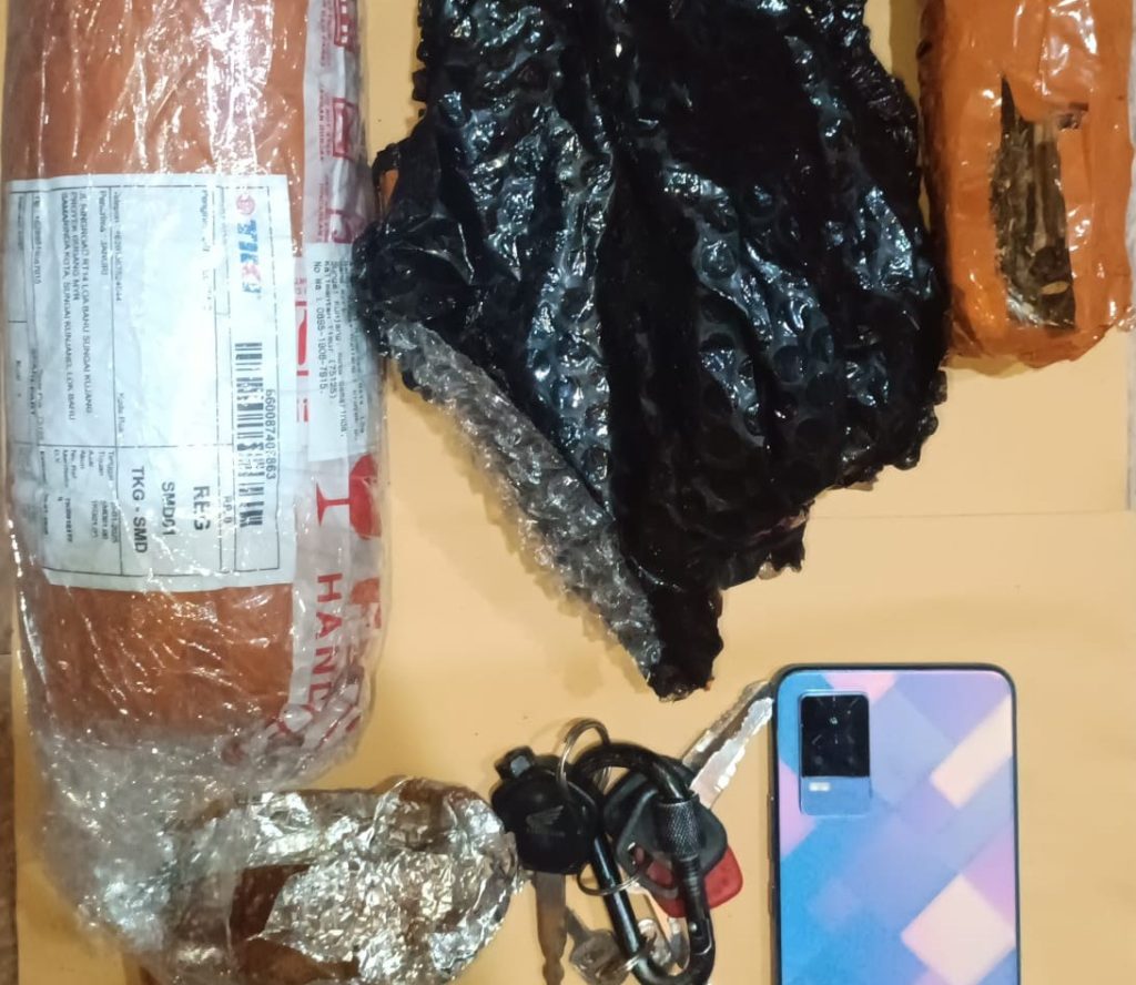 Saat dilakukan pemeriksaan, ditemukan barang bukti berupa: Sebungkus ganja dengan berat bruto 113 gram, dibalut lakban cokelat. Sebuah lembar aluminium foil, Plastik pembungkus hitam dan pembungkus berlabel TIKI, Sebuah telepon seluler. Sepeda motor Honda yang digunakan tersangka.