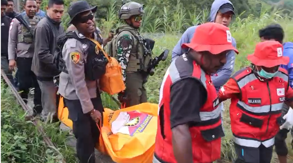 Dengan medan yang sulit di jangkau, personel Satgas Ops Damai Cartenz bersama anggota Polres Puncak Jaya dan TNI, telah berhasil menjangkau korban dengan menempuh jalur yang cukup ekstrem menuruni jurang sedalam 500 meter demi mengangkat korban.